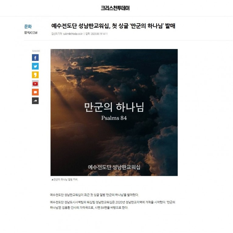 뮤직타임 [기사] 예수전도단 성남판교워십, 첫 싱글 ‘만군의 하나님’ 발매(크리스천투데이)