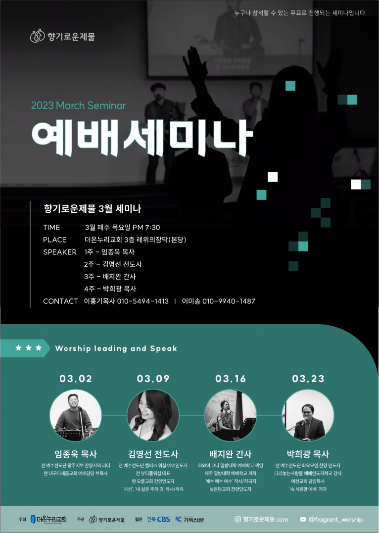 목요찬양모임 ‘향기로운 제물’이 주최하고 더온누리교회가 후원하는 예배세미나가 열린다.