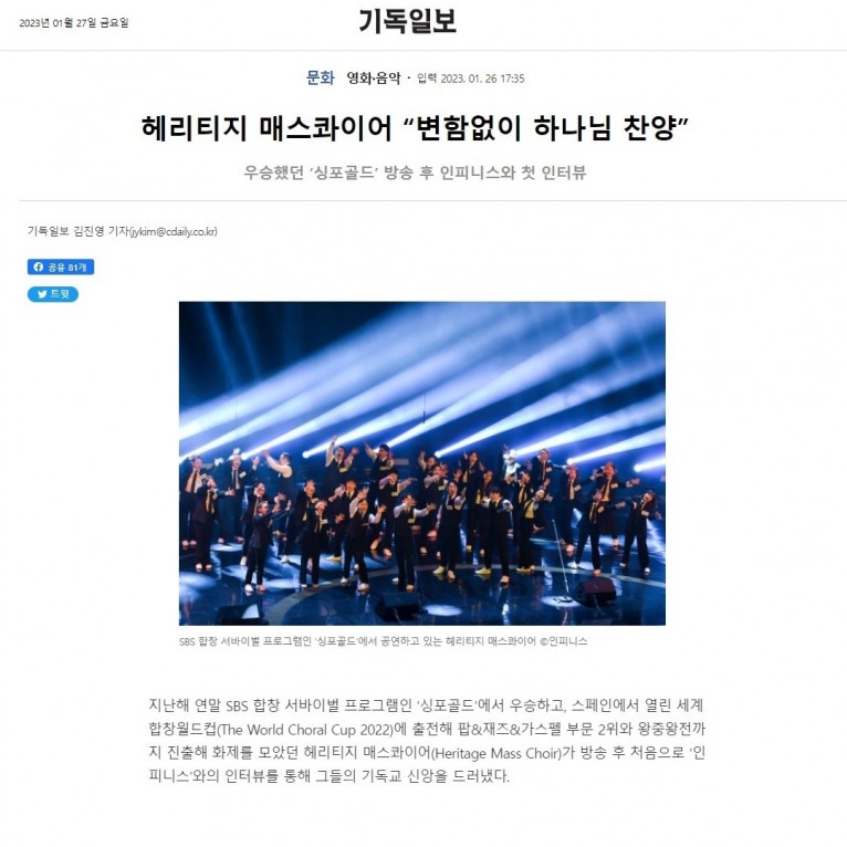 지난해 연말 SBS 합창 서바이벌 프로그램인 ‘싱포골드’에서 우승하고, 스페인에서 열린 세계합창월드컵(The World Choral Cup 2022)에 출전해 팝&재즈&가스펠 부문 2위와 왕중왕전까지 진출해 화제를 모았던 헤리티지 매스콰이어(Heritage Mass Choir)가 방송 후 처음으로 ‘인피니스’와의 인터뷰를 통해 그들의 기독교 신앙을 드러냈다.