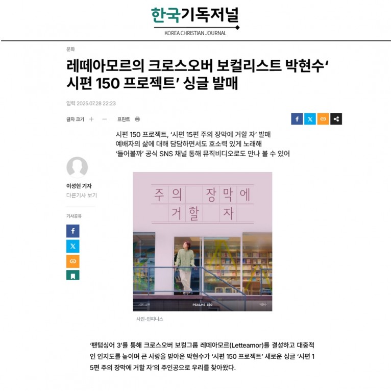 [기사] 레떼아모르의 크로스오버 보컬리스트 박현수‘ 시편 150 프로젝트’ 싱글 발매(한국기독저널)