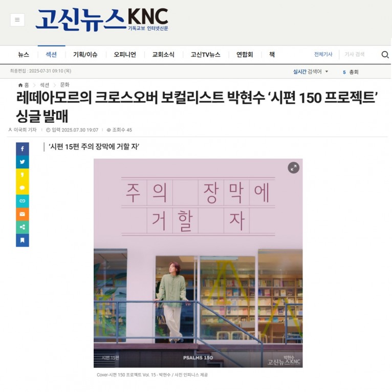 뮤직타임 [기사] 레떼아모르의 크로스오버 보컬리스트 박현수 ‘시편 150 프로젝트’ 싱글 발매(고신뉴스 KNC)