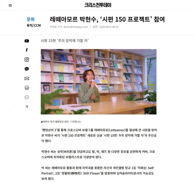 뮤직타임 [기사] 레떼아모르 박현수, ‘시편 150 프로젝트’ 참여(크리스천투데이)