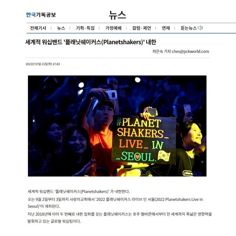 오는 9월 2일부터 3일까지 사랑의교회에서 '2022 플래닛쉐이커스 라이브 인 서울(2022 Planetshakers Live in Seoul)'이 개최된다.