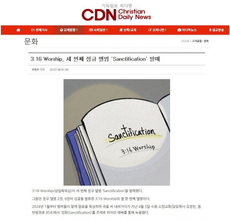 [기사] 3:16 Worship, 세 번째 정규 앨범 'Sanctification' 발매(기독일보 씨디엔)