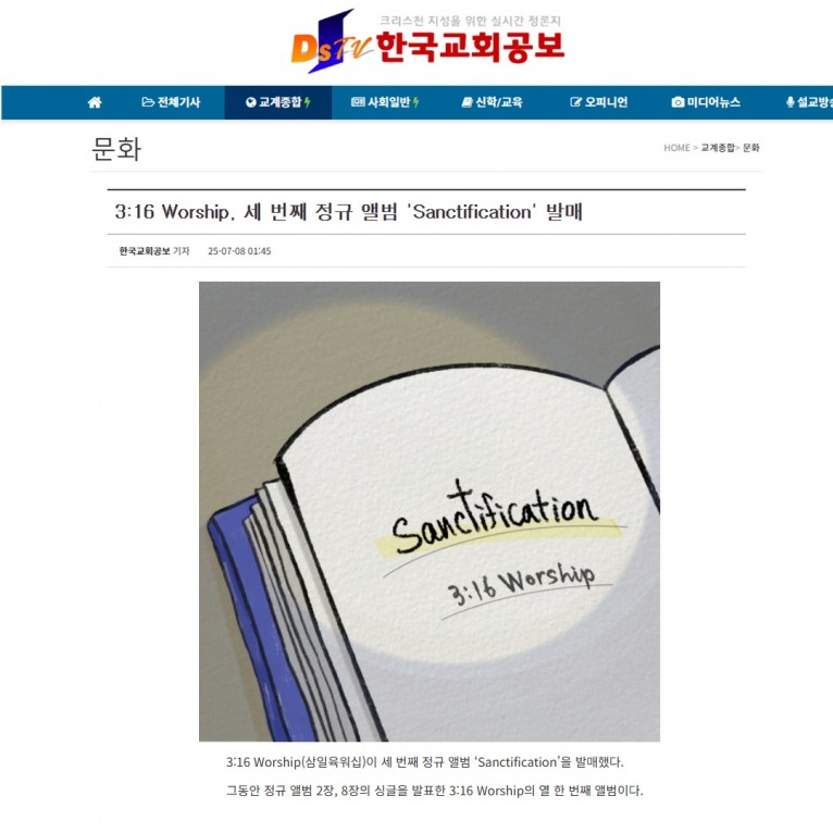 [기사] 3:16 Worship, 세 번째 정규 앨범 'Sanctification' 발매(한국교회공보)