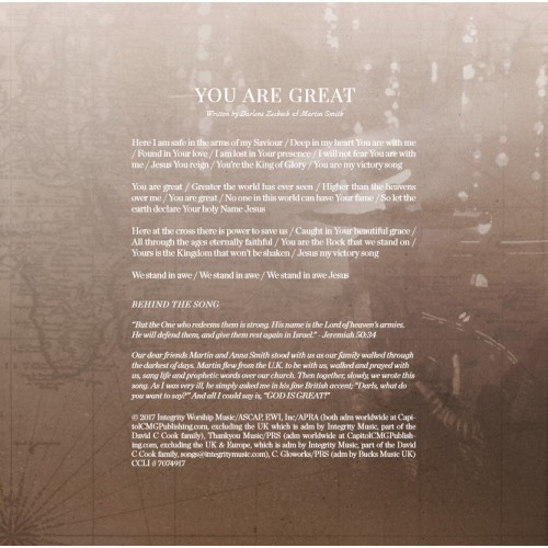 몽환적인 분위기의 미디엄 템포로 시작되는 1번 트랙 ‘You are Great’은 그녀의 인생에서 가장 도전이 되었던 시절 딜리리어스의 마틴 스미스(Martin Smith)와 함께 작업한 곡으로 하나님의 크심을 선포하면서 시작된다. 앨범 자켓에 보면 각 노래의 비하인드 스토리가 담겨 있는데 이 곡에 대해 이렇게 얘기하고 있다.