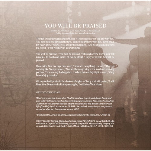 2번 트랙 ‘You Will Be Praised’는 암 치료 후에 미국에서 폴 발로쉬(Baloche), 존슨(Johnson)과 함께 쓴 곡으로 삶의 어떤 상황과 어떤 시절 가운데서도 두려워하지 않는 우리들 가운데 역사하시는 성령님의 능력을 선포하는 곡이다.