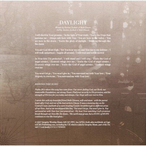 3번 트랙 ‘Daylight’는 시편 18편의 내용을 담고 있는데, 실수가 없으신 주님, 우리의 반석, 움직이지 않는 뿌리, 강한 성루 되신 하나님의 약속과 사랑의 힘은 오늘 그리고 평생 안전함을 고백하고 있다.