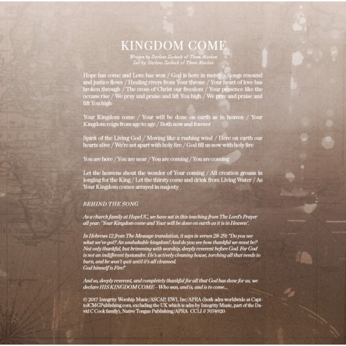 4번 트랙 ‘Kingdom come’은 나라가 임하시오며, 뜻이 하늘에서 이루어진 것같이 땅에서도 이루어지이다. 주기도문의 내용으로 하나님의 나라와 주권을 선포하고 있다.