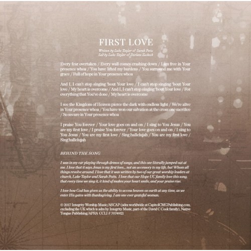“이 찬양은 제가 많은 데모 찬양곡 들을 운전하면서 듣다가 갑자기 마음에 떠오르게 되었습니다. 예수님이 나의 첫사랑 되심을... 내 삶의 악세사리가 아닌 내 삶의 모든 것의 이유가 되시는 분이라는 것을요. 이 찬양은 저희 교회 두 명의 찬양인도자, 룩 테일러와 사라 폿츠가 써 주었다는 것이 참 기쁩니다. 또 이 찬양을 교회에서 부를 때마다 성도들의 얼굴에서 스며 나오는 마음의 행복함이 느껴져 나의 고백 또한 커지게 됨을 감사합니다. 우리가 감사함으로 성문에 들어갈 때 천국으로 들어갈 수 있도록 허락하신 주님이 너무 좋습니다. 주님께 너무 감사드립니다.”