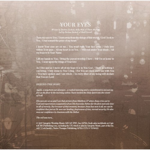 7번 트랙 ‘Your Eyes’도 기도 중에 받은 곡으로 분주한 하루를 시작하면서 하나님을 놓치지 않고 세상에서 눈을 돌려 주를 볼 때 주님의 시선이 나를 향해 있고 내게서 돌아서지 않음을 고백하고 있다.