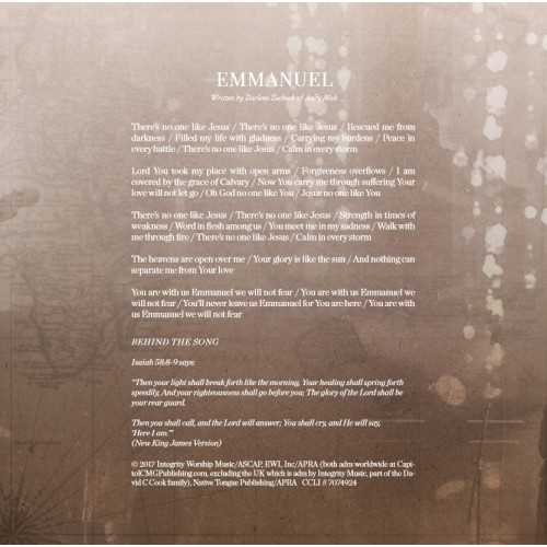 8번 트랙 ‘Emmanuel’은 주님이 함께하시기 때문에 두려움이 없고 임마누엘로 절대 떠나지 않음을 고백하는 곡이다. 너무나 잘 알고 있는 내용이지만 어쩌면 우리 삶에서 너무 쉽게 잊고 살고 있지 않나 하는 생각이 든다.