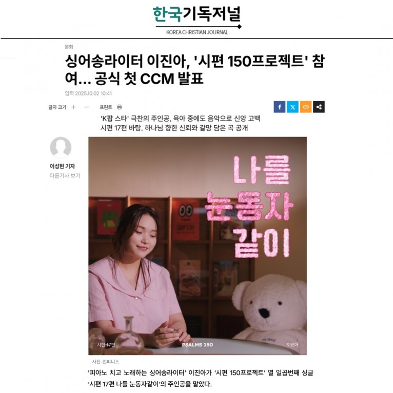 [기사] 싱어송라이터 이진아, '시편 150프로젝트' 참여... 공식 첫 CCM 발표(한국기독저널)